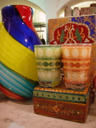 入り口から一番目立つところにはカラフルなモロッカン・グラスが置かれていた。ゴールドを必ずといっていいほど使用した繊細なデザインで見るものを魅了している。モロッコではいつもモロッコ菓子と一緒にミントティーをいただくのが定番だそうで、その時に使われるのがこのモロッカン・グラスだという。こんなに小さいけど、耐熱性に優れていて、分厚いガラスを使っているので割れにくいモロッカン・グラス。グラス以外にも、グラスの中にキャンドルを入れてもいい感じ。お値段も$4.90からと、とてもお安いのでオススメしたい。