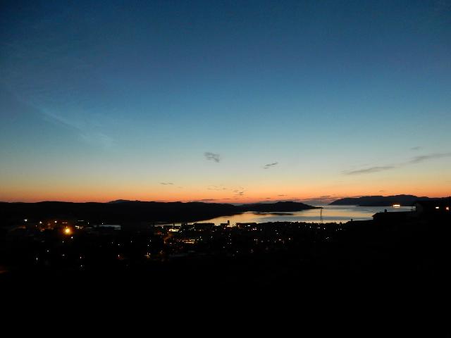 皆さん、こんばんわ~。とうとうオーロラ観測初日の日を迎えました。めちゃくちゃ気が早くて、本当にどうしようもない私です。是が非でも見たい気持ちが抑えられなくて。。(^0^;)昨晩は、深夜12時~1時半まで丘の上にいました。本音として、奇跡を起きてくれ~と思いながら、待っていたのですが、結果は残念でした。まあ仕方ないです。まだまだ完全に夜には、なってませんので、薄暗い中での調査であったので、厳しいね。(笑)そんな状況の中でも、水平線の下で太陽は右へ動いてまして、その夕方みたいな状況が、夜の21時過ぎから朝(日の出)2時40分まで続くのです。完全なる真っ暗は来月中旬までお預けかな