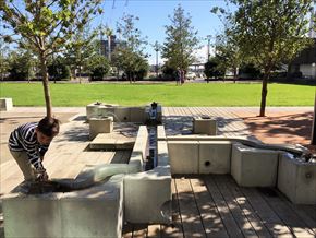 体を動かすと言えば、図書館の裏側には小さいながらも公園があり、ボタンを押したら水が出たり、