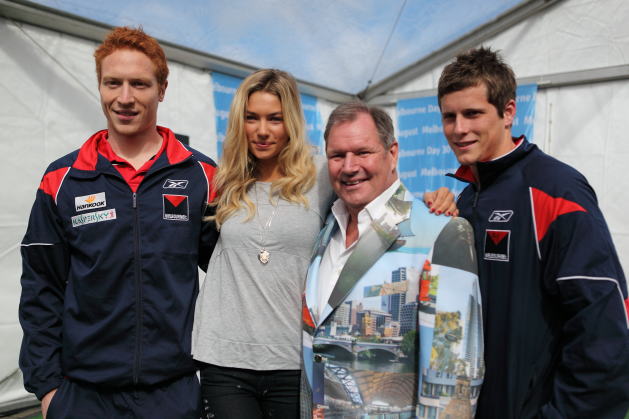 ロバート・ドイル メルボルン市長の隣にはモデルさん。両脇には、AFLオーストラリアン・フットボールのメルボルン・デーモンズ(Melbourne Damons)の選手。