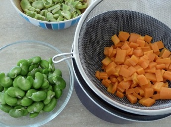 3、薄切りにして1cm角に切った人参と、そら豆を一緒に火が通るまで2-3分茹でる。