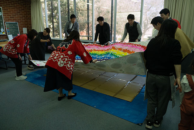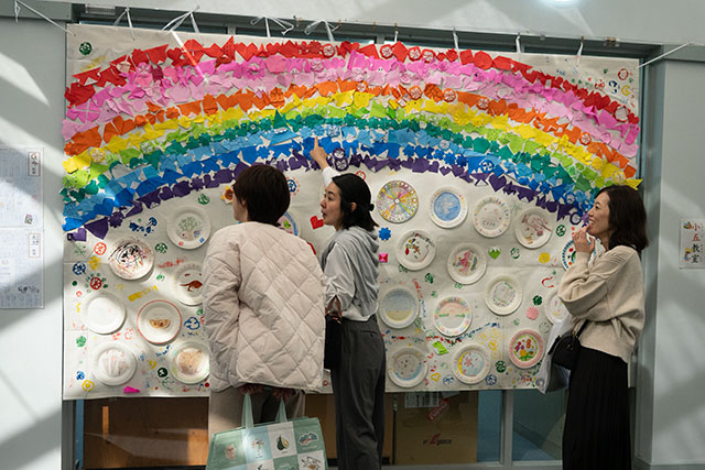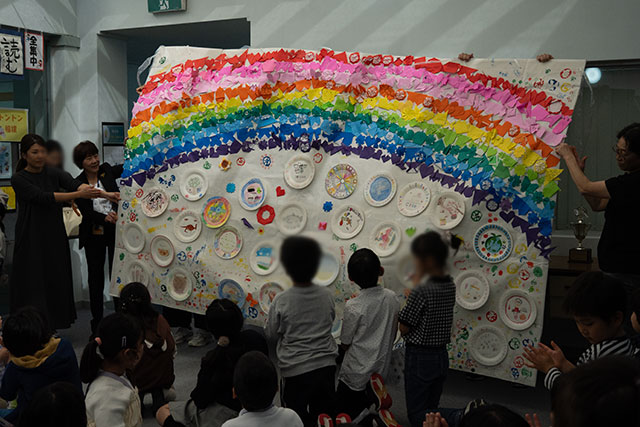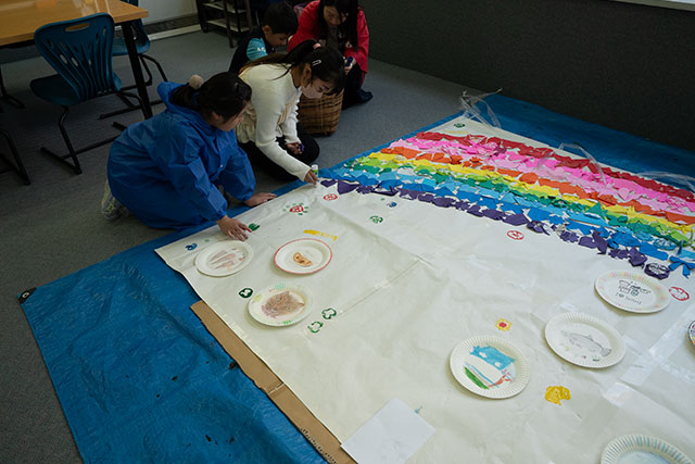 さらに、大きな模造紙に色とりどりの折り紙を貼り付けて虹を作る共同アートも行われました。