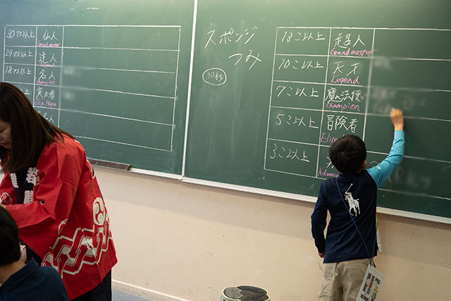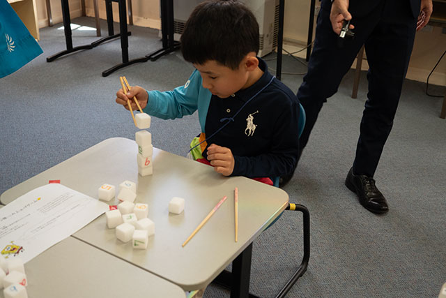 「上手なお箸の使い方」を紹介するビデオを見ながらの小豆うつしやスポンジ積み上げも大盛況。