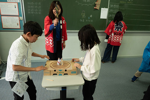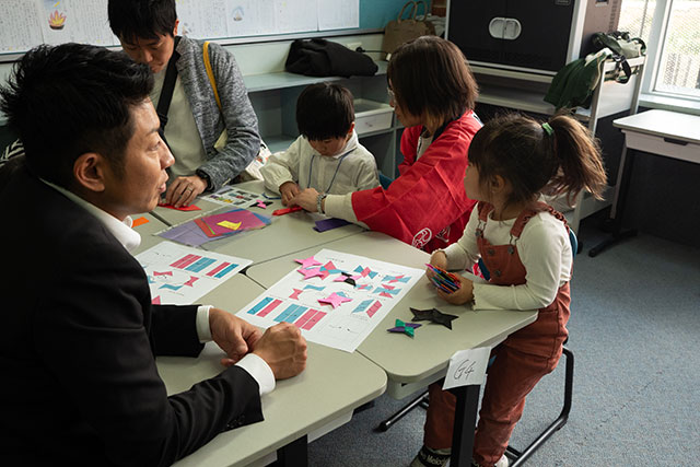 トントン相撲の力士、手裏剣、紙飛行機など、保護者の方々が優しくコツを教える姿もあり、温かい光景が広がりました。